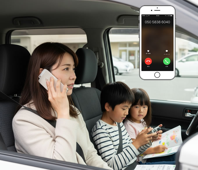 整理券に印字された 050から始まる専用番号に電話をかけるだけで、自動音声によりご自身の順番を確認できます。 アプリのインストールや事前登録などの面倒な手続きは一切不要です。