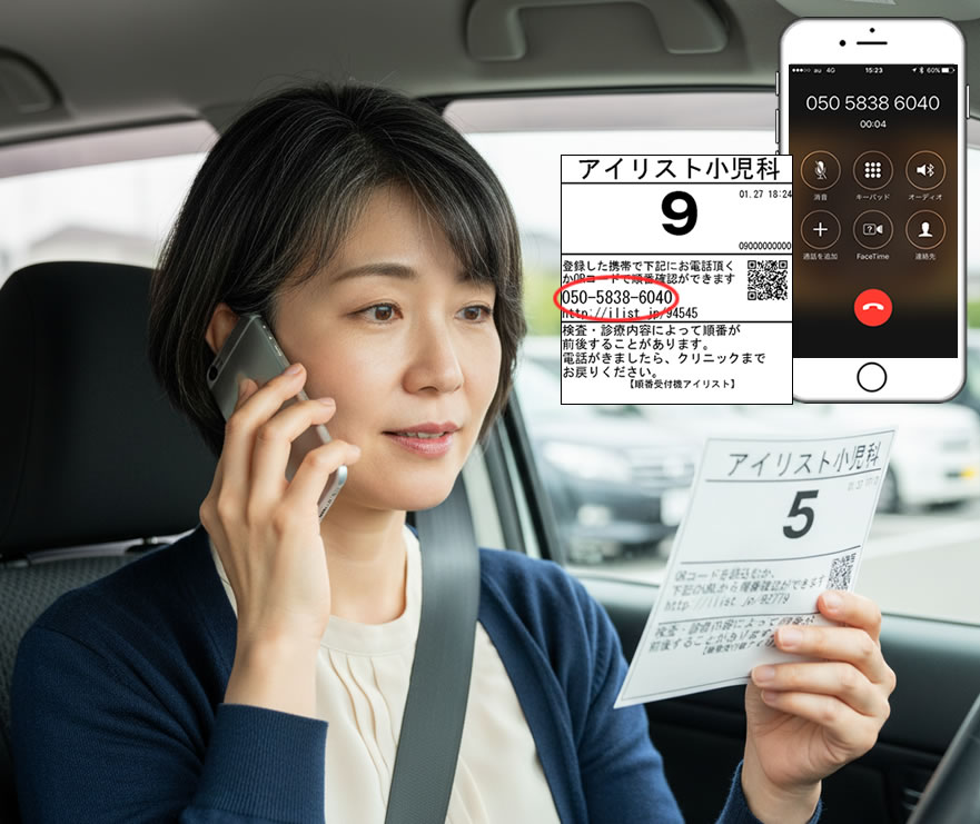 順番が近づくと、患者様の携帯電話へシステムが自動で発信。受話器を取ると、「あと3番で順番となります。クリニック待合室までお戻りください。」という自動音声でご案内します。