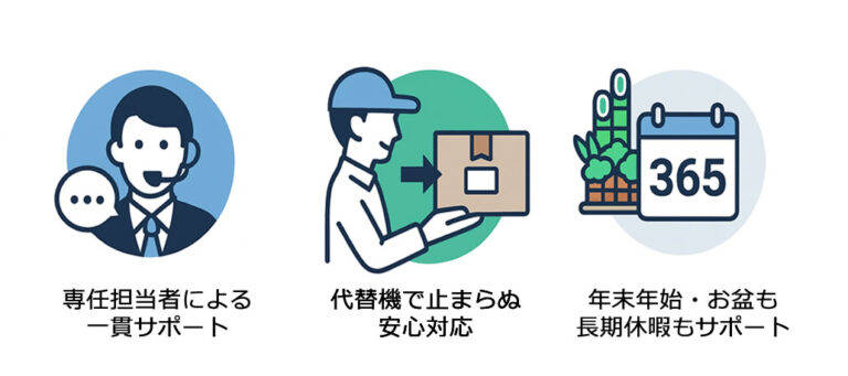 ご利用中の環境に合わせた代替機をすぐにお届けするので、運用が止まることはありません。